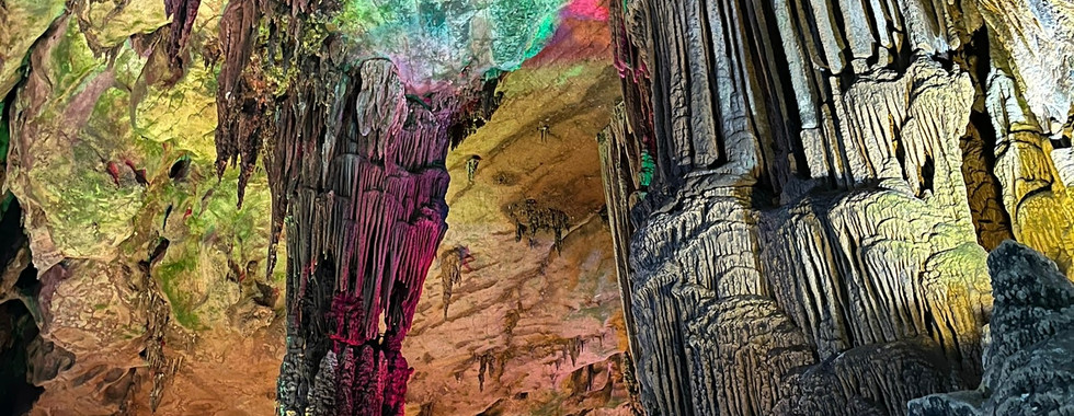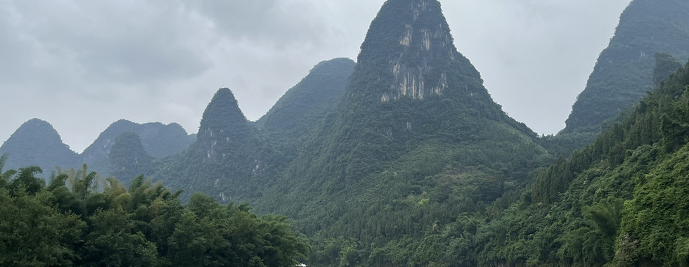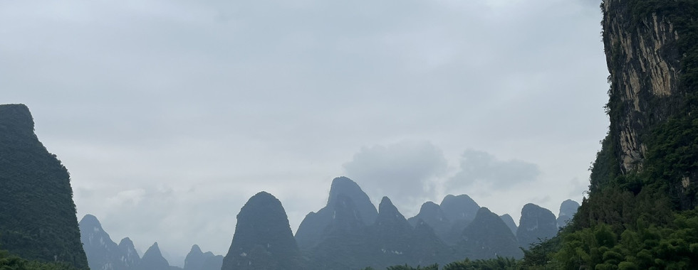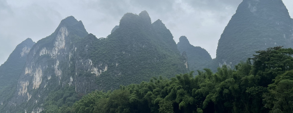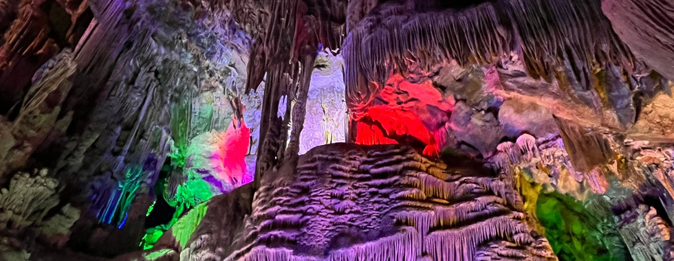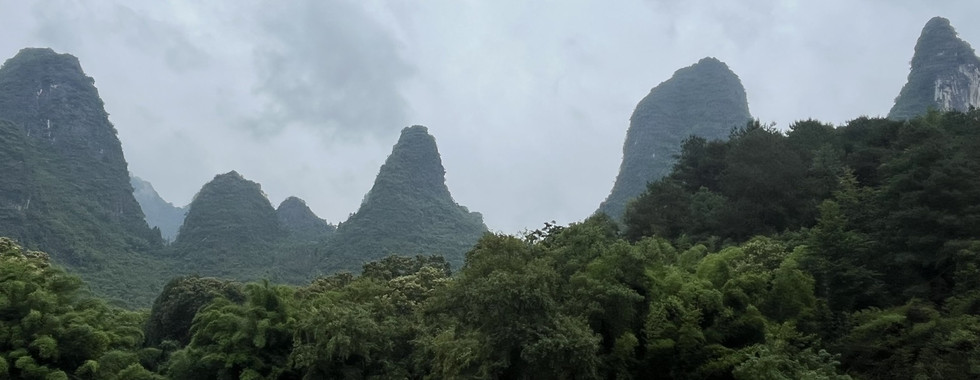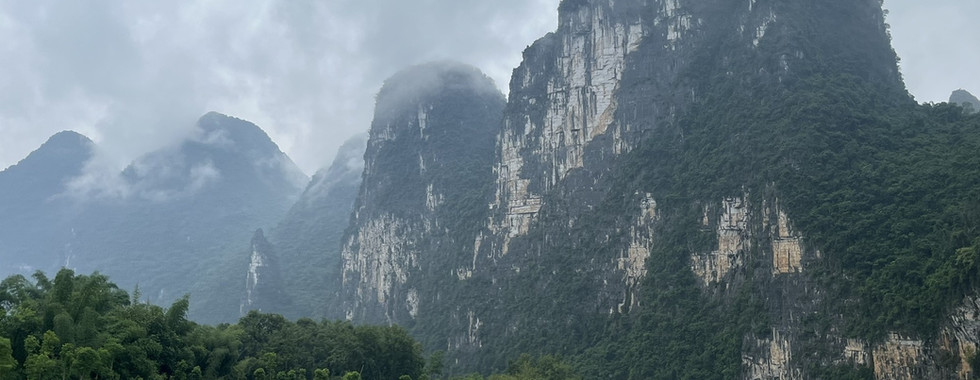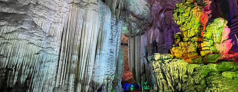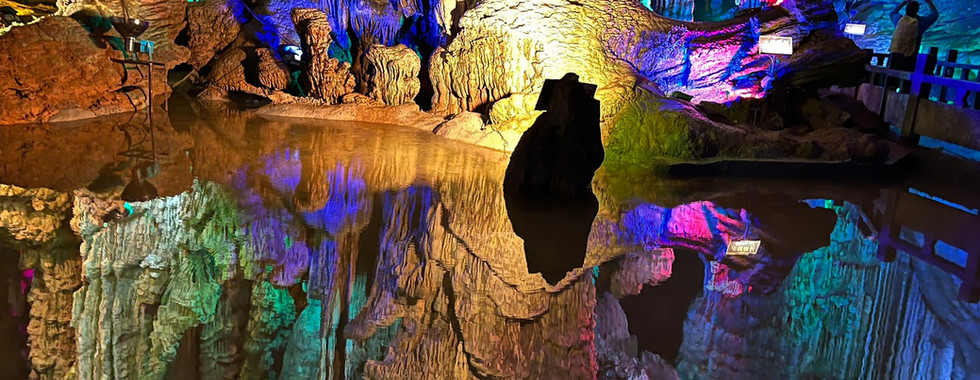 We started our second day in Yangshuo with a visit to the Longmen Water Cave, about an hour drive from our lodge. This impressive cave gave us a view from the inside out of a karst structure. It was well set up for visitors with safe walkways, clear signage, and a steady stream of quirky comparisons: rock formations dubbed “giant mushroom”, “eagle’s head”, “rice fields” or even “Buddha temple”. While we admired the creativity, we would have preferred less theatrical lighting, fewer neon colours would have let the cave’s natural beauty shine through. Still, a unique and memorable experience.