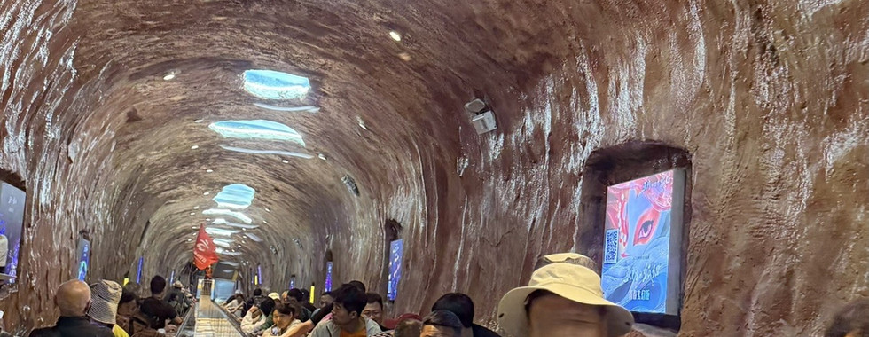 Still, standing at the base, staring up at the gate flanked by two towering grey cliffs, I was in awe. The cave’s almost perfectly symmetrical shaping into the mountain makes you wonder: was this nature’s lucky accident or something more mysterious? To get up close, you can take on the “Stairway to Heaven”, a 999 stone steps straight up to the base of the arch. It’s a blend of natural beauty and human design, and a good workout. For those less inclined to conquer stairs, a series of hidden escalators inside the mountain offers a smooth ride up. Two of us opted for the escalators, while one took the stairs. He did beat us to the top!