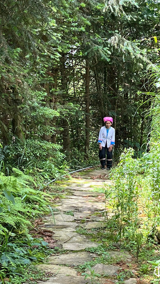 It was an elderly, petite lady dressed in the traditional clothing I had noticed earlier in the village: dark pants and a light jacket adorned with embroidered bands. What stood out most was her bright pink headpiece: towel-like in texture and casually wrapped high around her head, tied behind like a soft crown. I had noticed many local women wearing similar head wraps, even when paired with modern clothing.