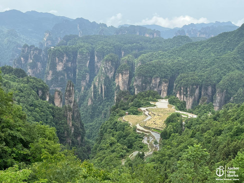 On our way between scenic spots, we stumbled upon an unexpected sight: rice fields perched high up on the mountain. I learned later they are officially called Fields in the Air (空中田园). Sitting at over 1,000 meters above sea level, the terraces were as stunning as they were surprising. They looked very much in use, though we couldn’t understand how, as there were no visible roads or paths leading to them. “Who, how… is anyone really farming up there?” we wondered. Our guide confirmed they belong to villagers living within the park, though even she wasn’t sure how they manage it. Perhaps, like in many parts of the world, here too it’s only the elders who still carry the knowledge and grit of centuries-old traditions.